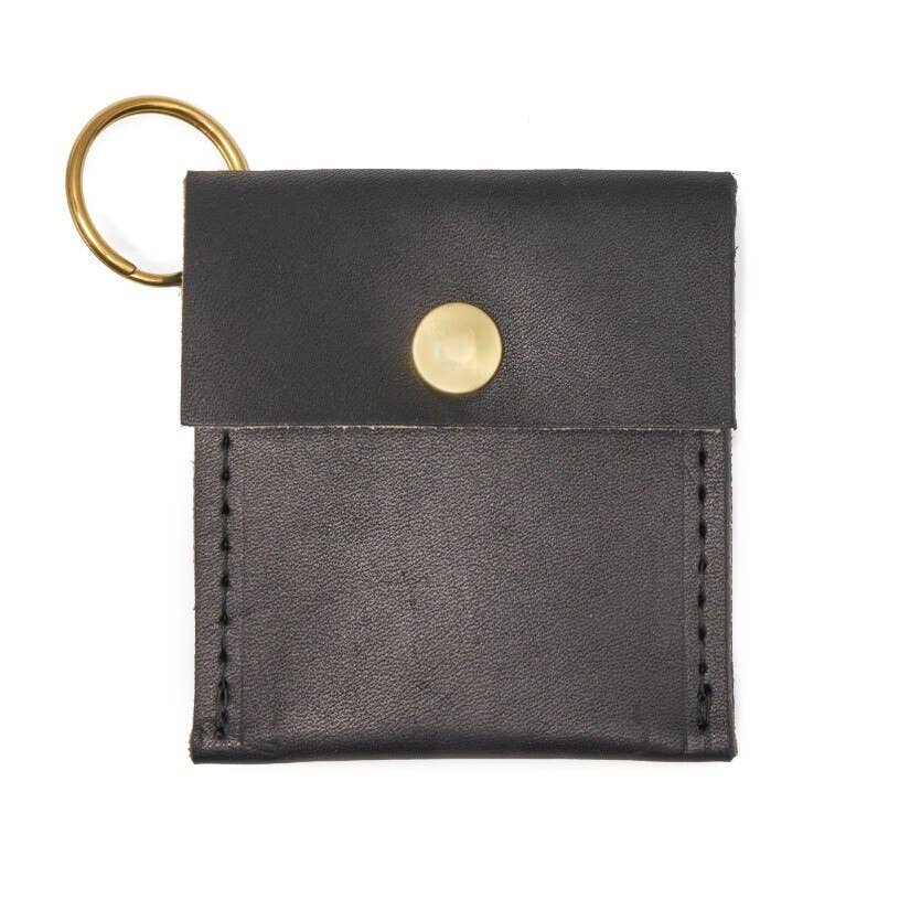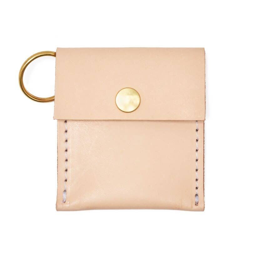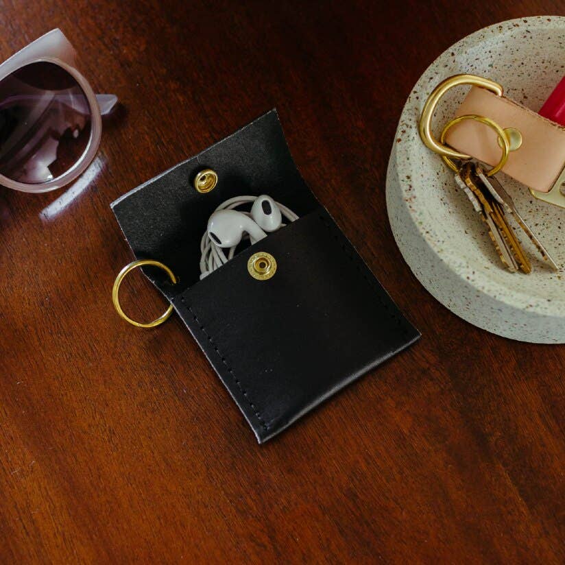 Our new leather pouch is the perfect size for Apple Airpods® in their case, old fashioned earbuds, pocket change, or whatever else you care to stash. Measuring 3 inches by 3 1/4 inches, and featuring a solid brass keyring, the Nan pocket easily fits onto keys, purses, or backpacks. Available in natural veg tan or black. MEASUREMENTS length: 3 1/4 in. width: 3 in.