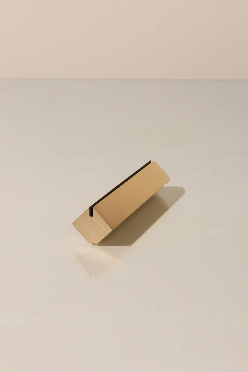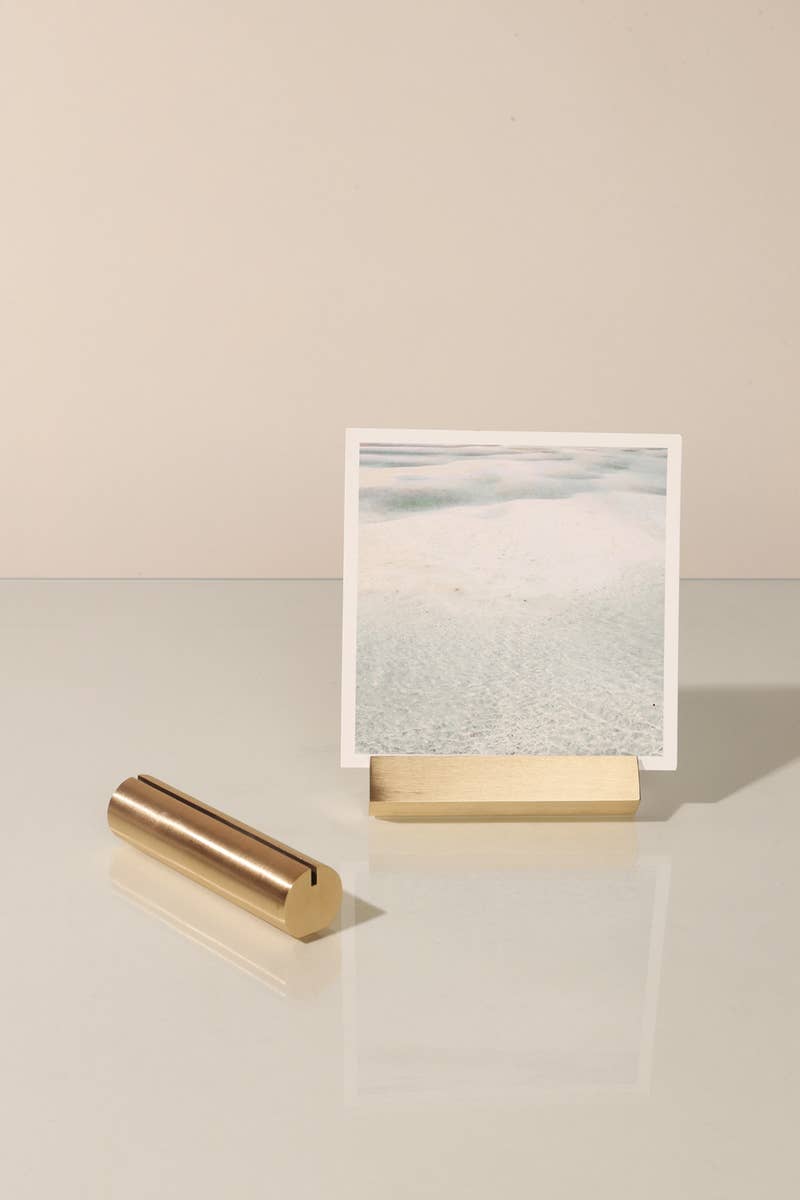 Geo rails provide a versatile display for photos and cards. Each solid brass piece is substantial and heavy with a nice feeling in the hand. A single geo rail can hold a variety of photo sizes or multiple photos at a time. Materials: solid brass, brushed finish. Dimensions: 4" L x 1" W x 1" H.