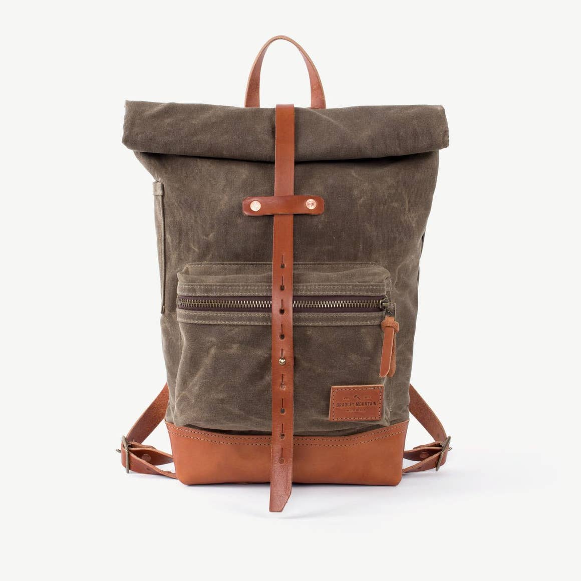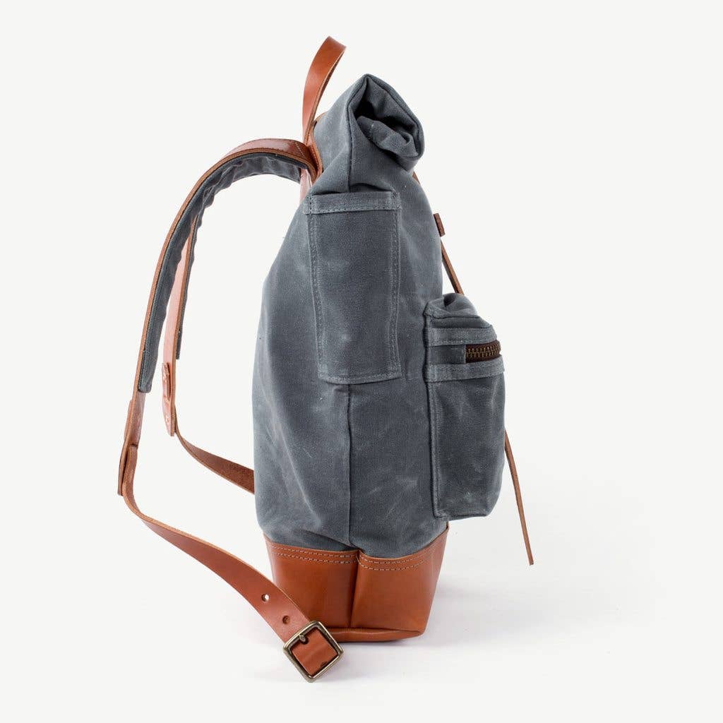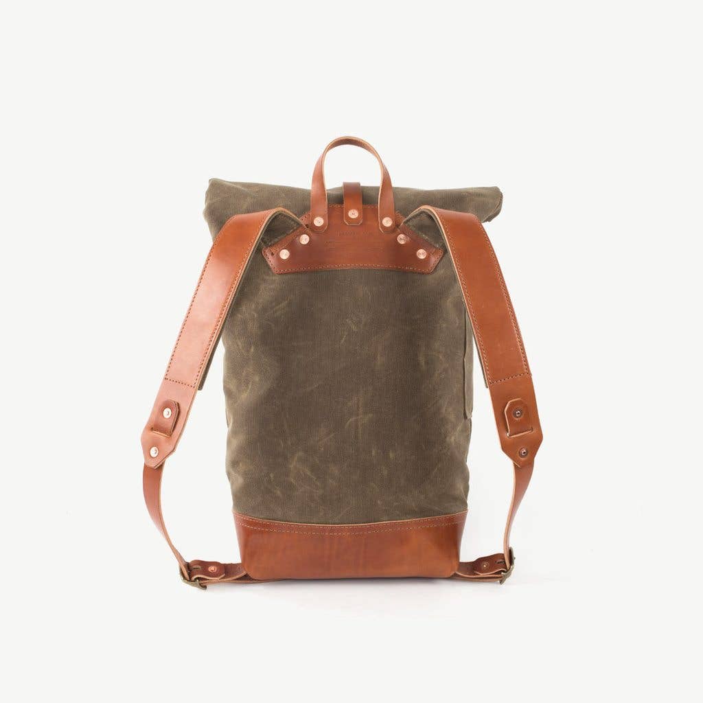 • 18 oz waxed duck canvas. • 9 oz Bridle leather. • Antiqued brass zipper. • Solid brass and copper hardware. • Roll top closure. • Wool padded straps. • Width 13" at the mouth of the bag tapering down to 10.5" at the leather bottom. • Height 22.5" when open, 17.5" when closed. • Depth 4.5". • Front Pocket 9" W x 6.5" H x 2" D. • Side Pocket 3" W x 5.5" H (perfect for pens). • Inside pocket 10" W x 12" H.